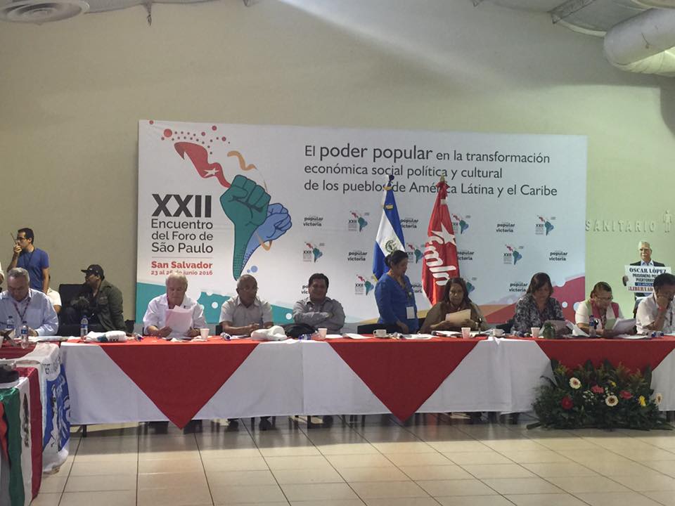 - Del 23 al 26 de junio de 2016, el Foro de São Paulo realizó su XXII Encuentro en El Salvador, país gobernado desde hace siete años por el Frente Farabundo Martí para la Liberación Nacional, que el día primero de este mes celebró el segundo aniversario de la toma de posesión del compañero presidente Salvador Sánchez Cerén.