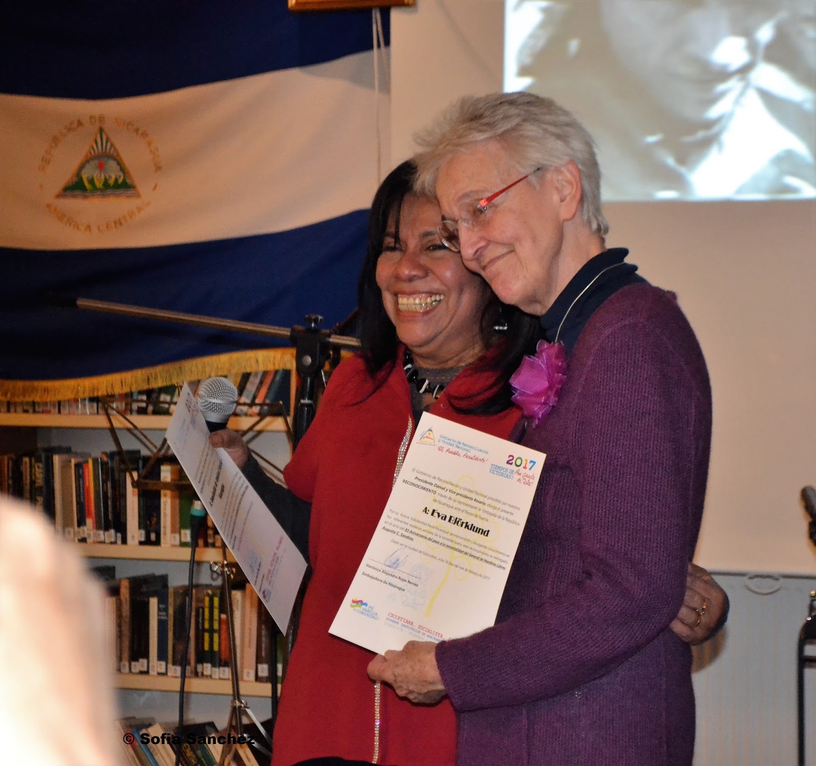 Esta actividad estuvo llena de reconocimientos a compañeros y compañeras suecas, latinos y nicas que han mantenido encendida la llama de la solidaridad por nuestra patria, hubo mucha euforia cuando se nombró a dos ciudadanos suecos que estaban presentes y son referente de la solidaridad con nuestra patria así como con los pueblos de Nuestramérica, Eva Björklund e Ingvar Enghardt, ambos recibieron largos y sostenidos aplausos.
