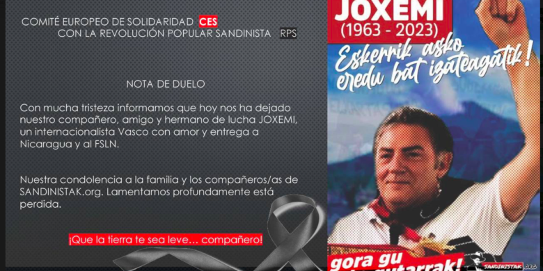 Estimados/as compañeros/as, con mucha tristeza os comunicamos que el Compañero JOXEMI, miembro de la entidad https://www.sandinistak.org, del País Vasco, amigo, hermano y compañero internacionalista de la solidaridad con Nicaragua y con el FSLN, ha fallecido. Extendemos todo nuestro cariño, respeto a su familia y amigos, queremos hacer llegar nuestra más sentida expresión de condolencia y solidaridad en estos … Sigue leyendo Compañero JOXEMI ¡Compa, que la tierra te sea leve!